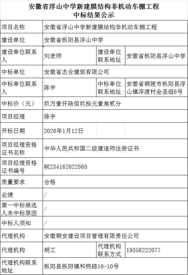 安徽省浮山中学新建膜结构非机动车棚工程中标结果公示
